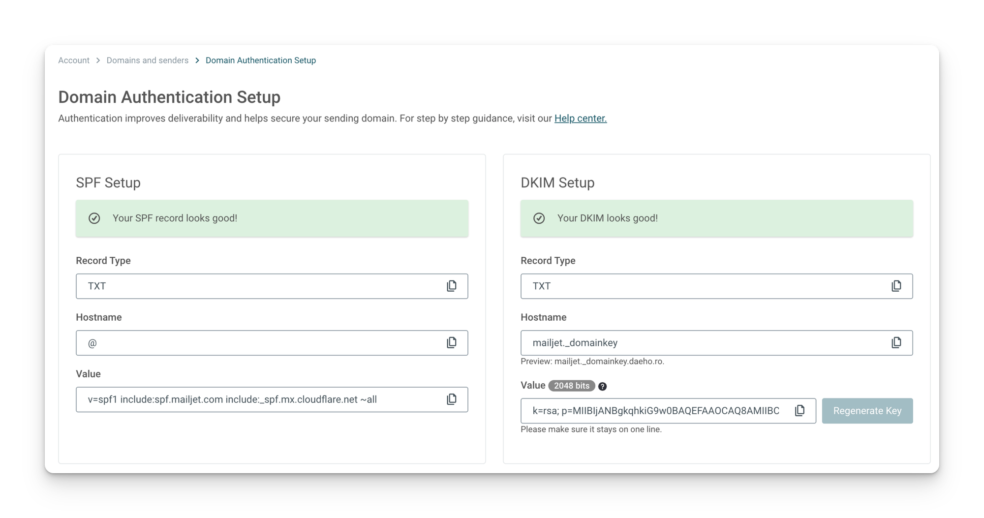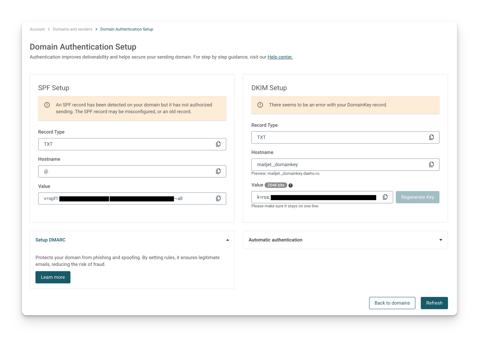 DNS 설정이 완료되었다. Mailjet의 설정 화면에서 Refresh 버튼을 눌러 정상적으로 처리되는지 확인한다.