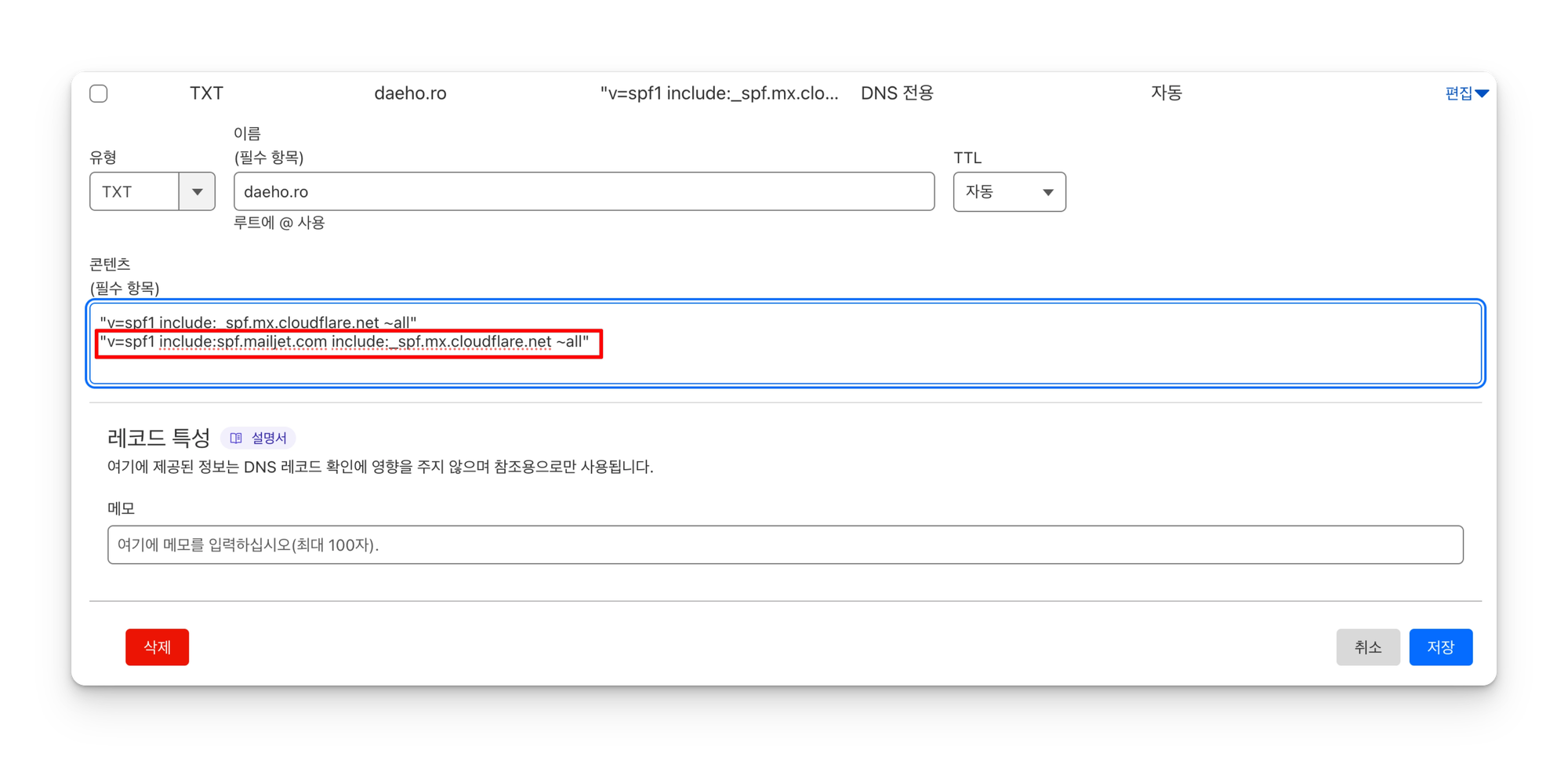 SPF 레코드는 이미 앞선 수신 설정을 진행하면서 클라우드플레어에서 자동으로 설정해버렸다. 그래서 새로 추가하는게 아니고 기존에 등록된 값을 수정해야 한다.
