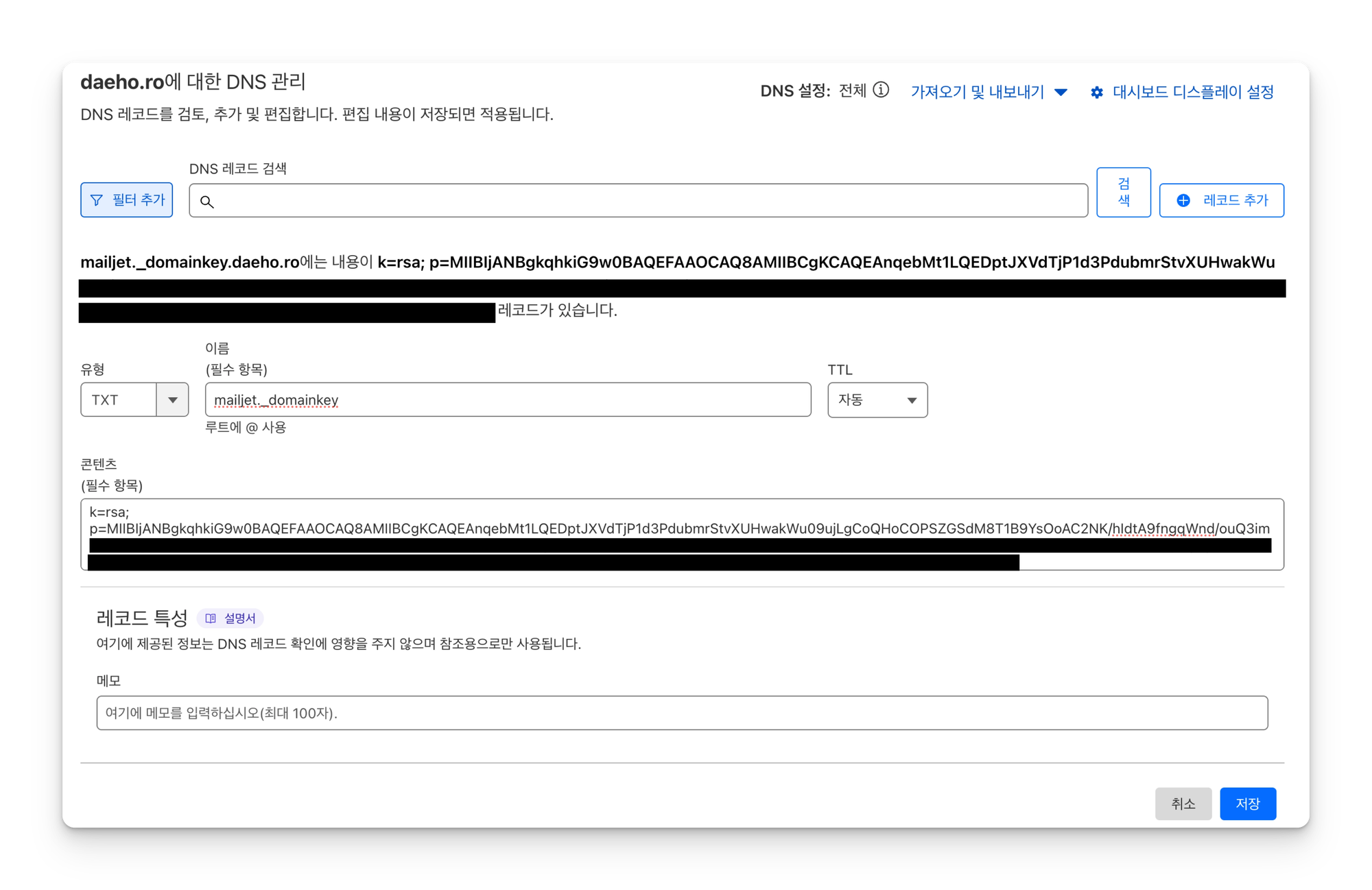 이렇게 새로 가져온 값이 빨간 박스 안의 값인데, 위에 이미 설정값이 존재한다. 윗 줄을 삭제하고 방금 가져온 새 값만 입력한다. DKIM 레코드는 새로운 값이므로 추가를 진행하도록 한다.