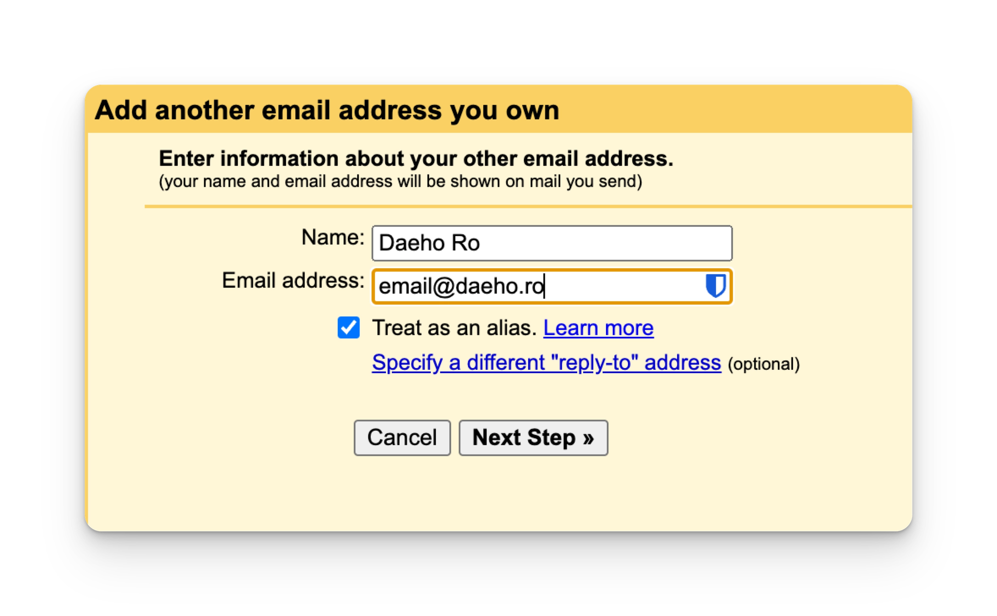중간쯤에 Send mail as: 항목에서 새 이메일 주소를 추가할 수 있는 버튼이 있다. 이를 클릭해서 SMTP 설정을 진행하도록 하자. 먼저 이름과 업무용 이메일을 입력한다.