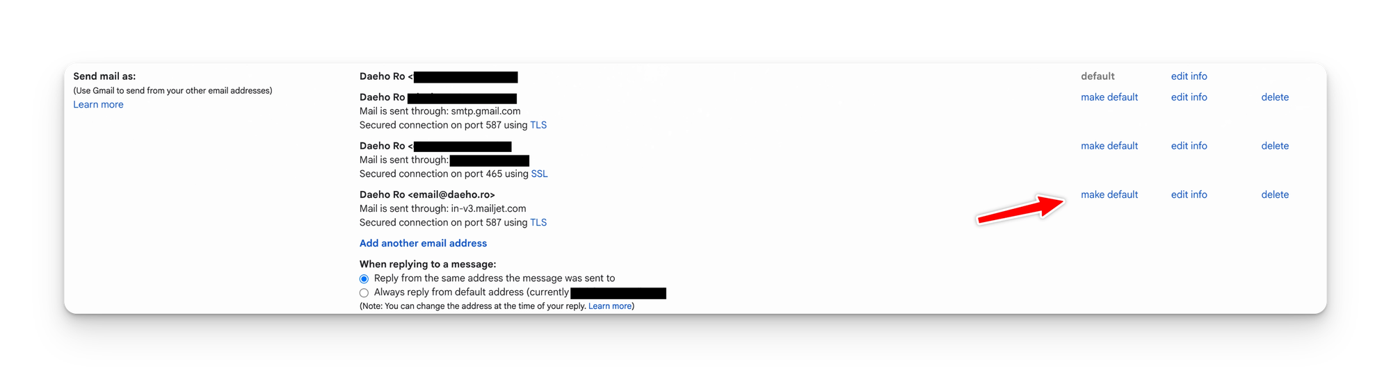 만약 라우팅 받은 Gmail 계정이 오직 업무용 이메일을 수신하기 위함이라면, 발신 메일 주소도 항상 업무용 이메일로 지정하는게 나을 수도 있다.