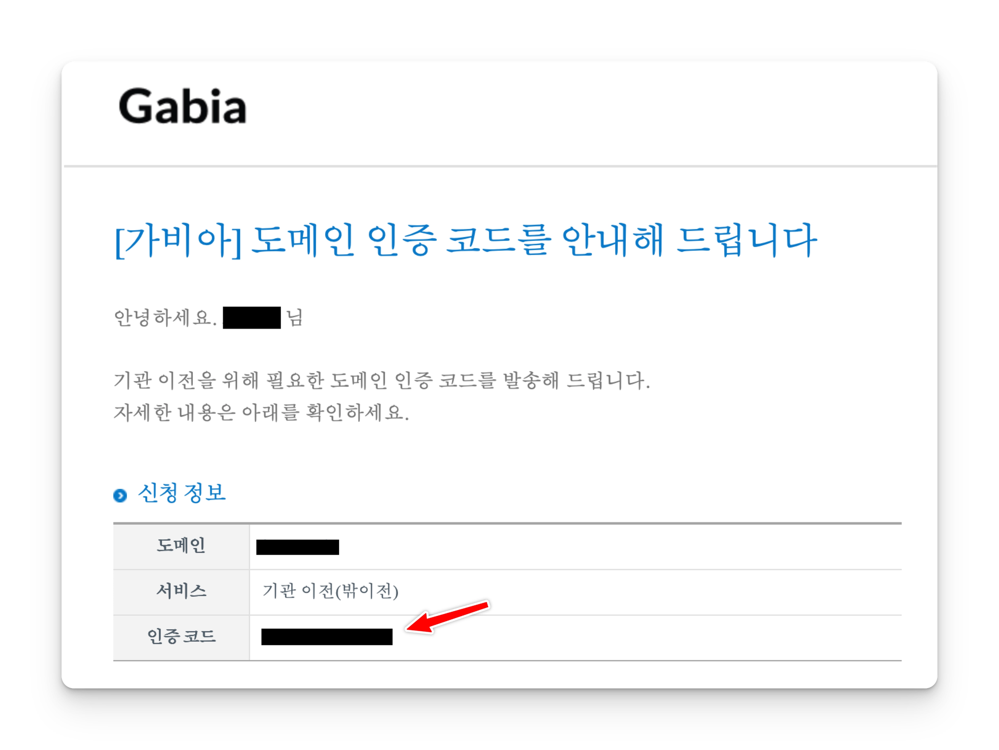가비아의 도메인 상세페이지에서 인증 코드 버튼을 클릭하여 다음과 같은 이메일을 수신했다.
