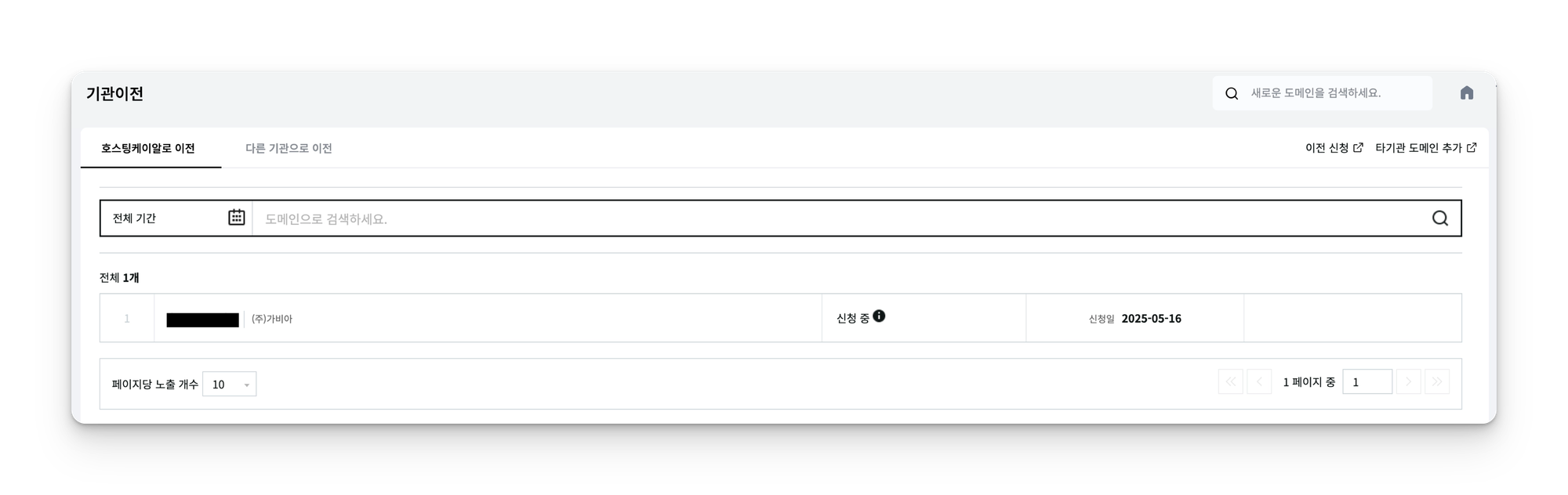 이제 이전 대상 기관인 호스팅케이알에서도 기관 이전 절차를 진행해야 한다. 다음의 기관 이전 페이지에서 도메인을 입력하여 이전 절차를 진행해보자.