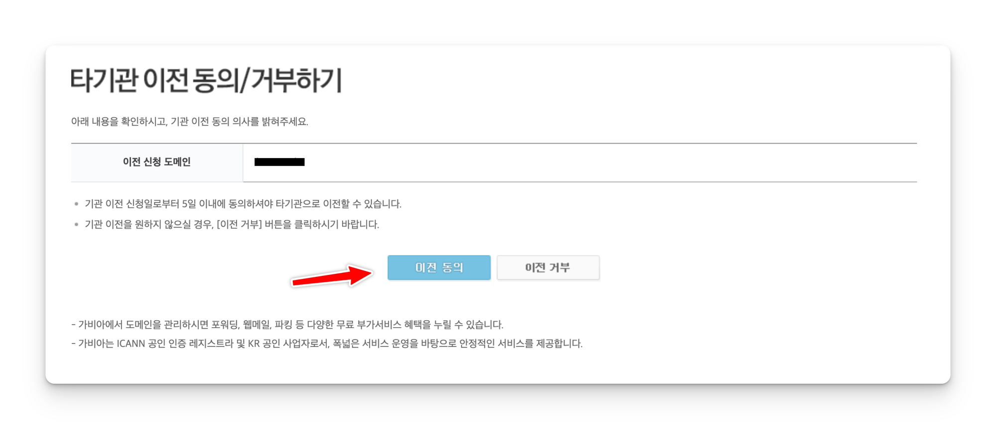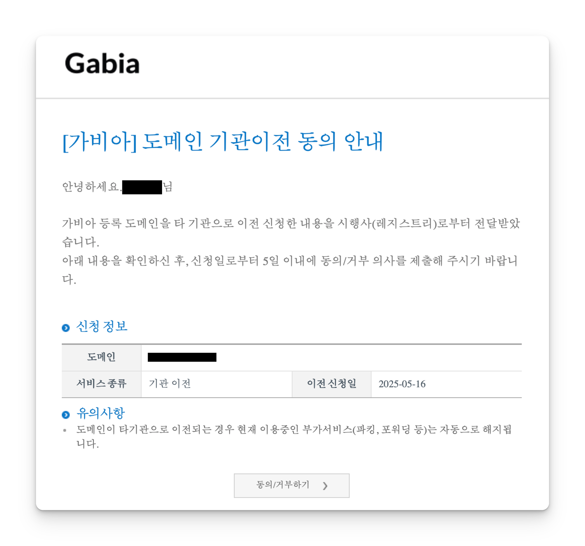 이제 가비아에서 이전 승인 이메일을 수신하고 승인만 해주면 된다. 결제하고 10분이 안된 것 같은데, 다음과 같이 이전 동의 안내 이메일을 수신했다.