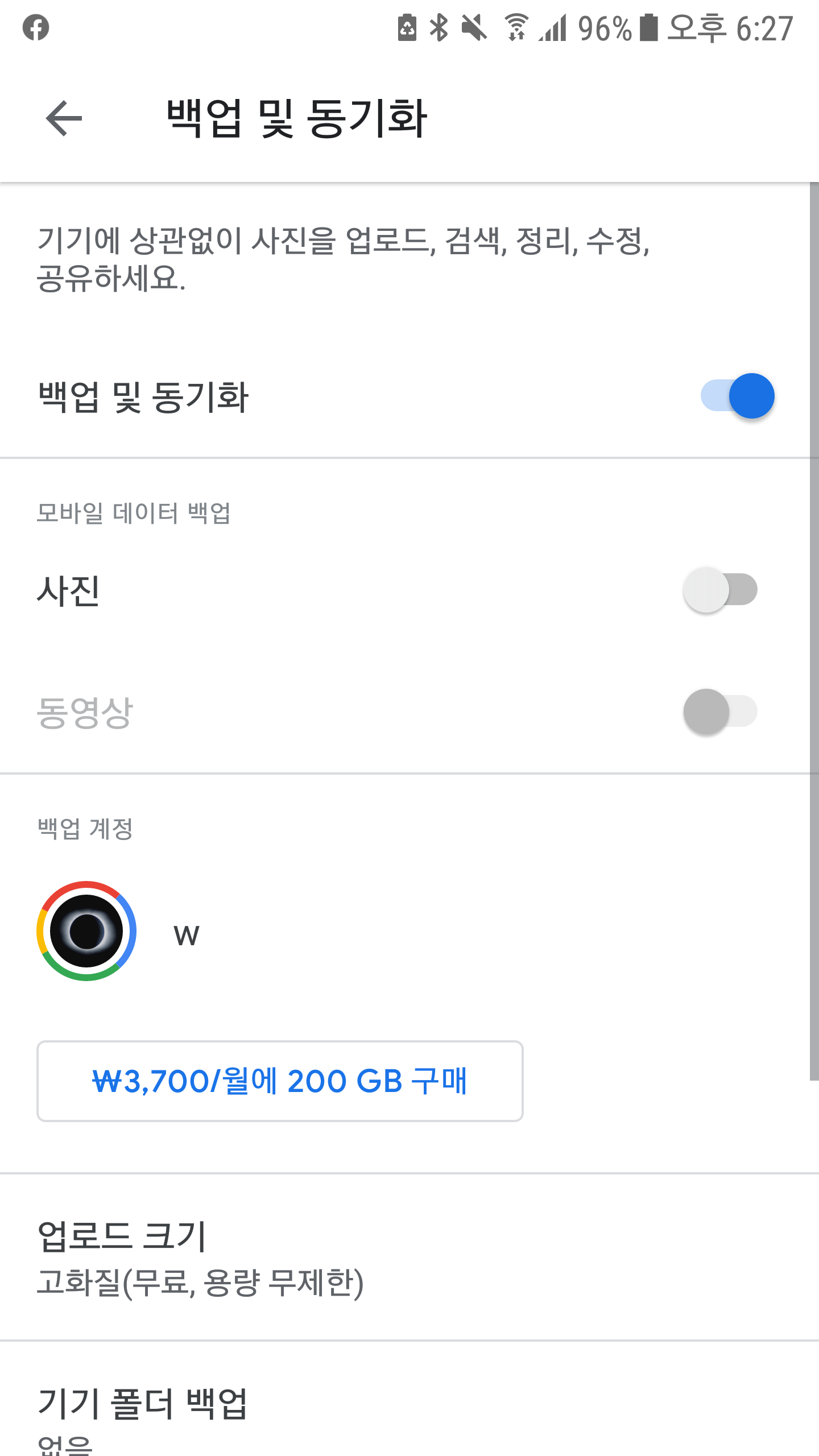 백업 및 동기화 옵션은 우측 상단 프로필을 눌러서 [포토 설정 > 백업 및 동기화]로 들어가시면 됩니다.