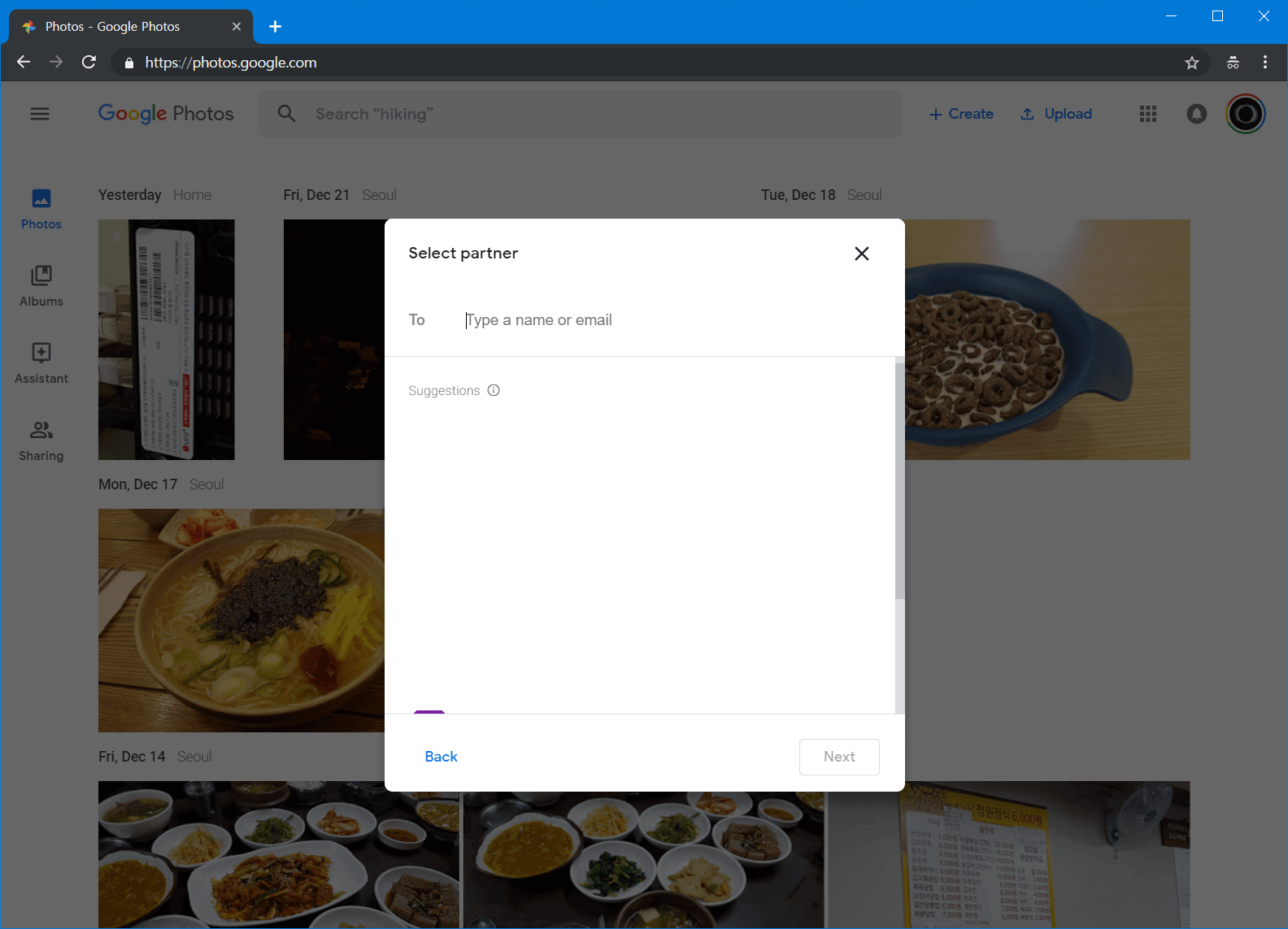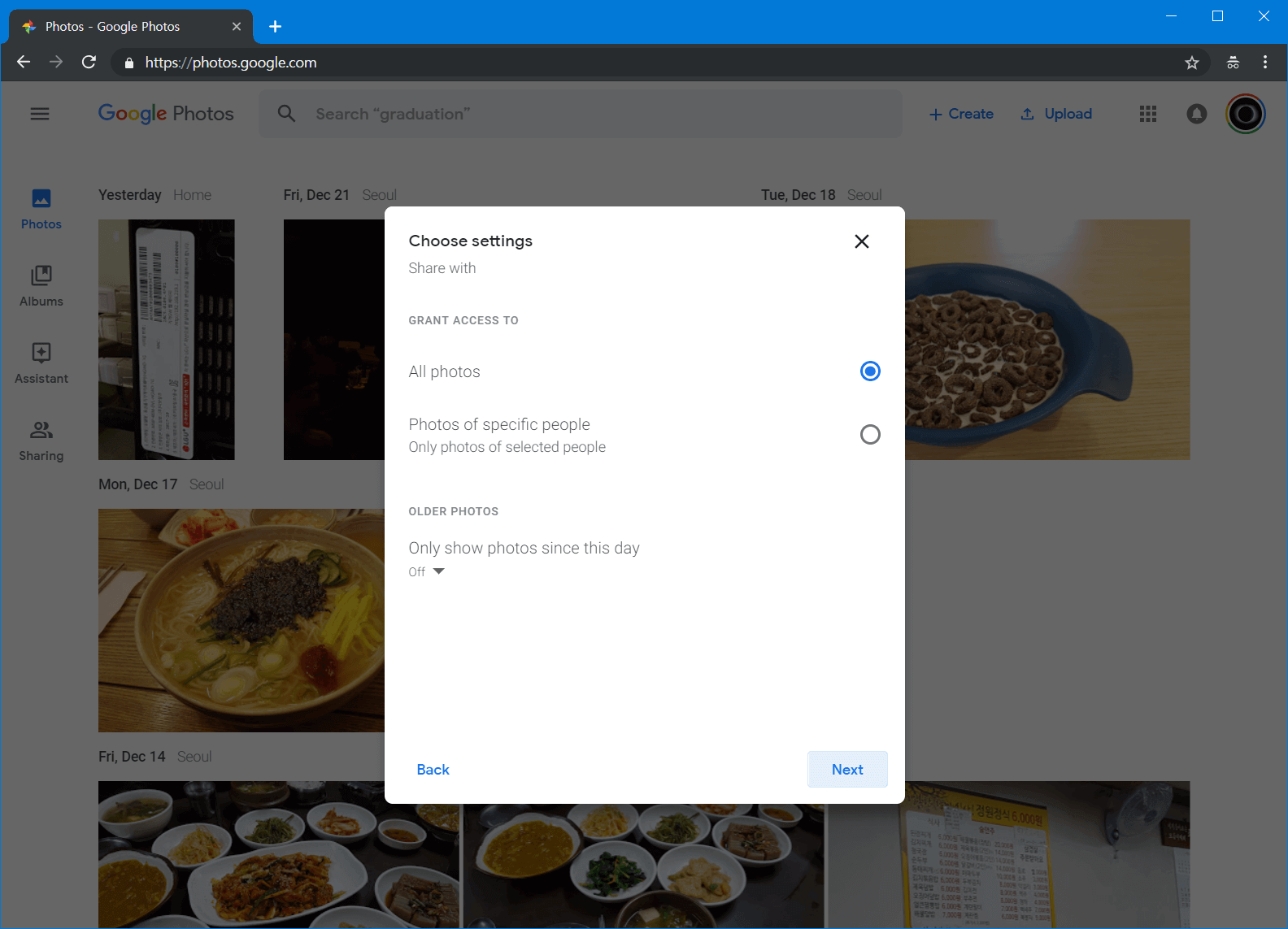 이메일을 정상적으로 선택하고 넘어오면 이제 무엇을 공유할 지 결정할 수 있습니다. 모든 사진을 선택할 수도 있습니다. 저는 12월 17일 이후의 사진만 공유하는 것으로 진행해보도록 하겠습니다.