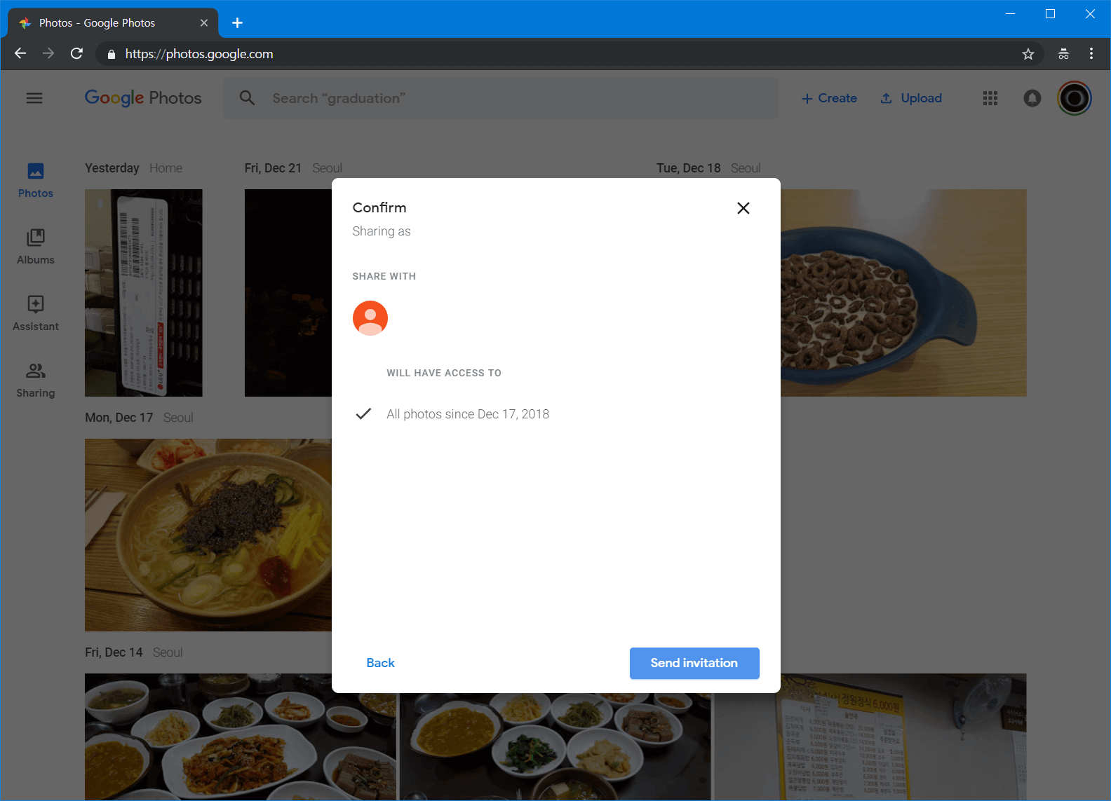 앞서 설정한 모든 내용이 제대로 되었는지 확인합니다. 공유하려는 계정, 공유하려는 사진의 종류를 확인하고 초대장을 발송합니다.