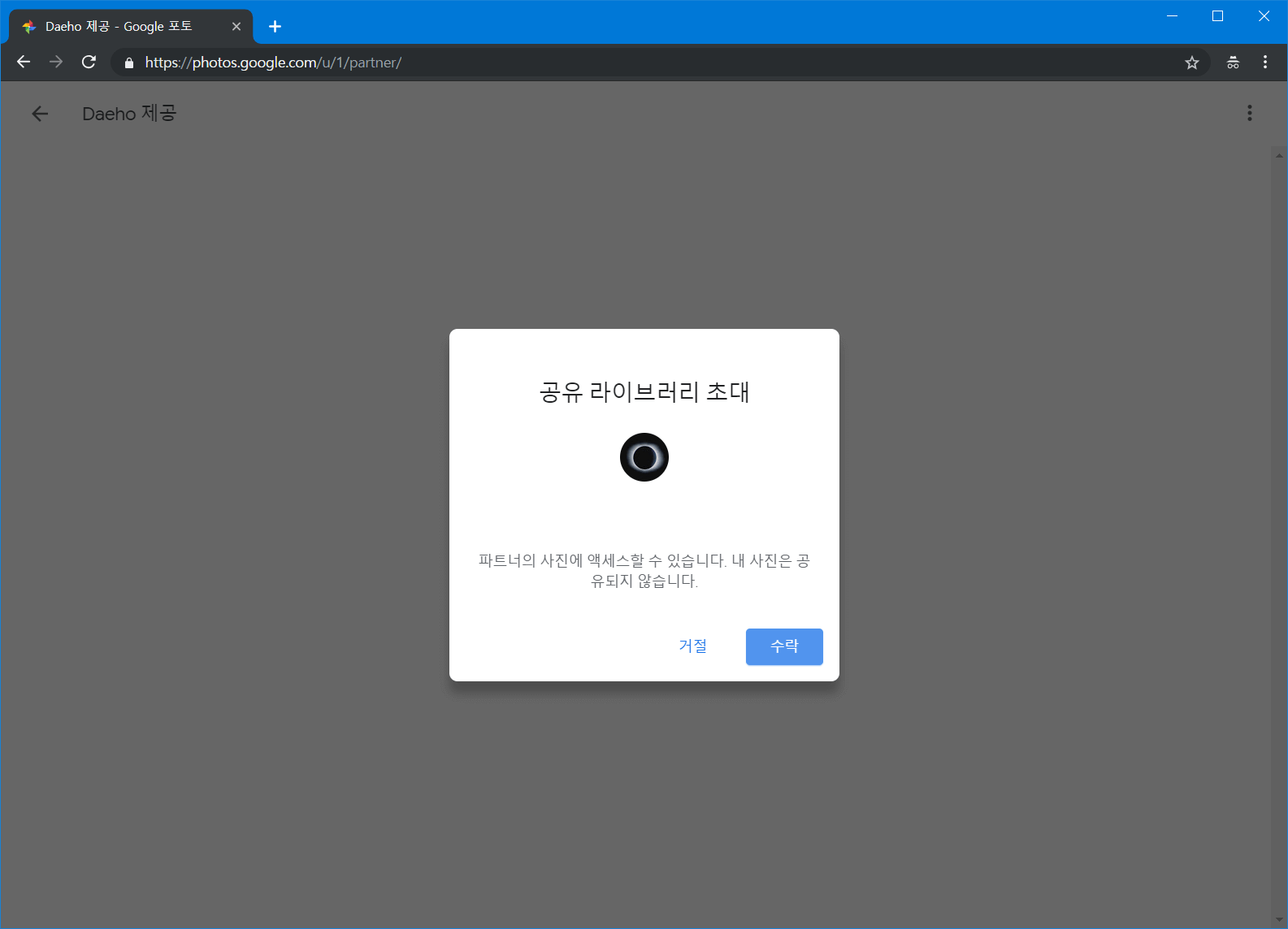 그러면 공유 라이브러리로 초대되었다고 나타납니다. 여기서 수락을 눌러 파트너 계정을 수락하면 됩니다.