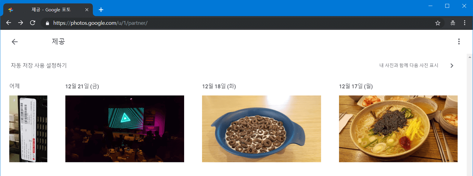 앞서 12월 17일 이후의 사진만 공유해서 총 4개의 사진만 나타나는군요. 모든 사진을 공유하셨다면 여기 전부 나타나게 될 겁니다. 다만 현재까지는 공유만 받은 것입니다. 이제 내 파트너 계정에 저장을 해야 합니다. 좌측 상단의 [자동 저장 사용 설정하기]를 눌러줍니다.