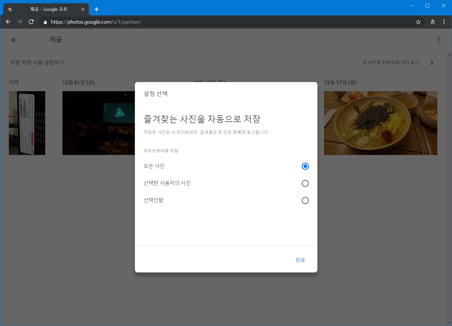 사진을 자동으로 저장하는 기준을 설정합니다. 모든 사진을 골라서 공유받는 모든 사진이 내 파트너 계정의 라이브러리로 들어오도록 하겠습니다.