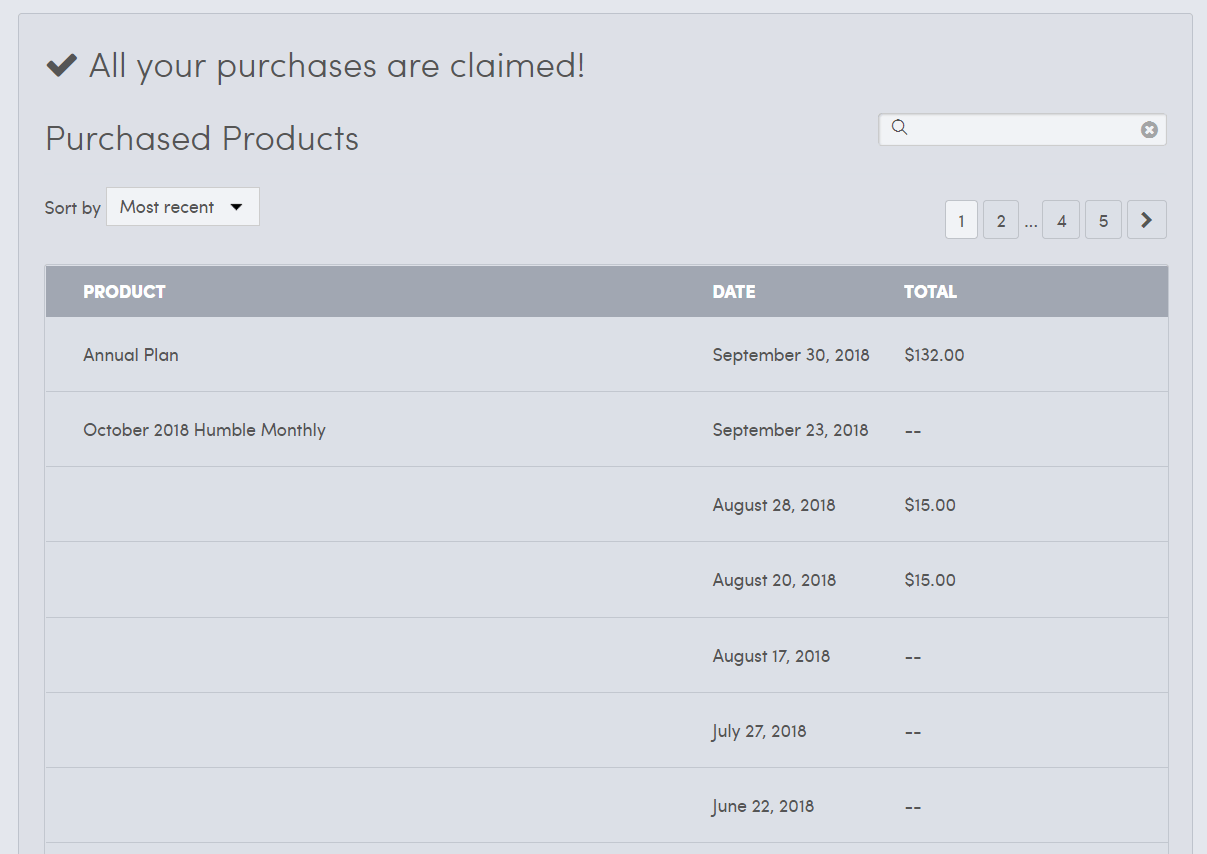 구독이 완료되면 위와 같이 우측 상단의 본인 이메일을 클릭하여 Purchase 페이지로 들어가면 확인이 가능합니다. 2번째 항목인 10월 험블 먼슬리를 눌러 들어가면 아래와 같은 페이지가 나타납니다.