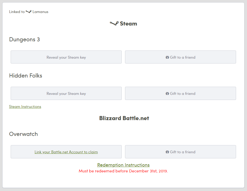 스팀 게임은 Reveal 하셔서 코드가 나오면 스팀에서 좌측 하단의 게임 추가를 눌러 등록하시면 됩니다. [링크] 다른 게임의 경우에도 코드로 나타나거나, 이번 달의 오버워치는 원하는 배틀넷 계정으로 연동만 시키면 됩니다.