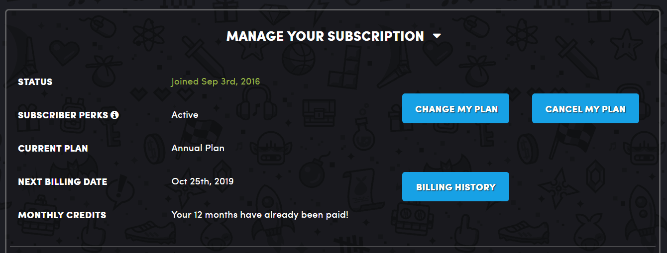 구독을 하게 되면 처음에 설정한 달 수가 지난 이후에 계속 결제가 됩니다. 그렇기 때문에 딱 해당 달의 번들만 구매하려면 구독하자마자 구독을 해지하는게 좋습니다. 구독을 해지한다고 하더라도 선 공개 게임 외에 다른 게임들이 공개될 때 여전히 해당 게임들은 수령할 수 있습니다. 아무 걱정 마시고 미리 해지하시기 바랍니다. 해지는 두 군데를 통해 가능합니다. 먼저 험블 먼슬리에서 See My Subscription이 있습니다.