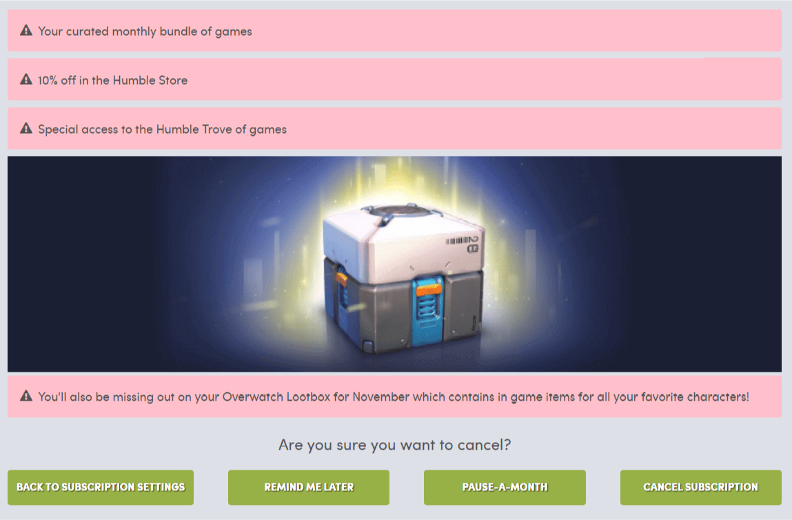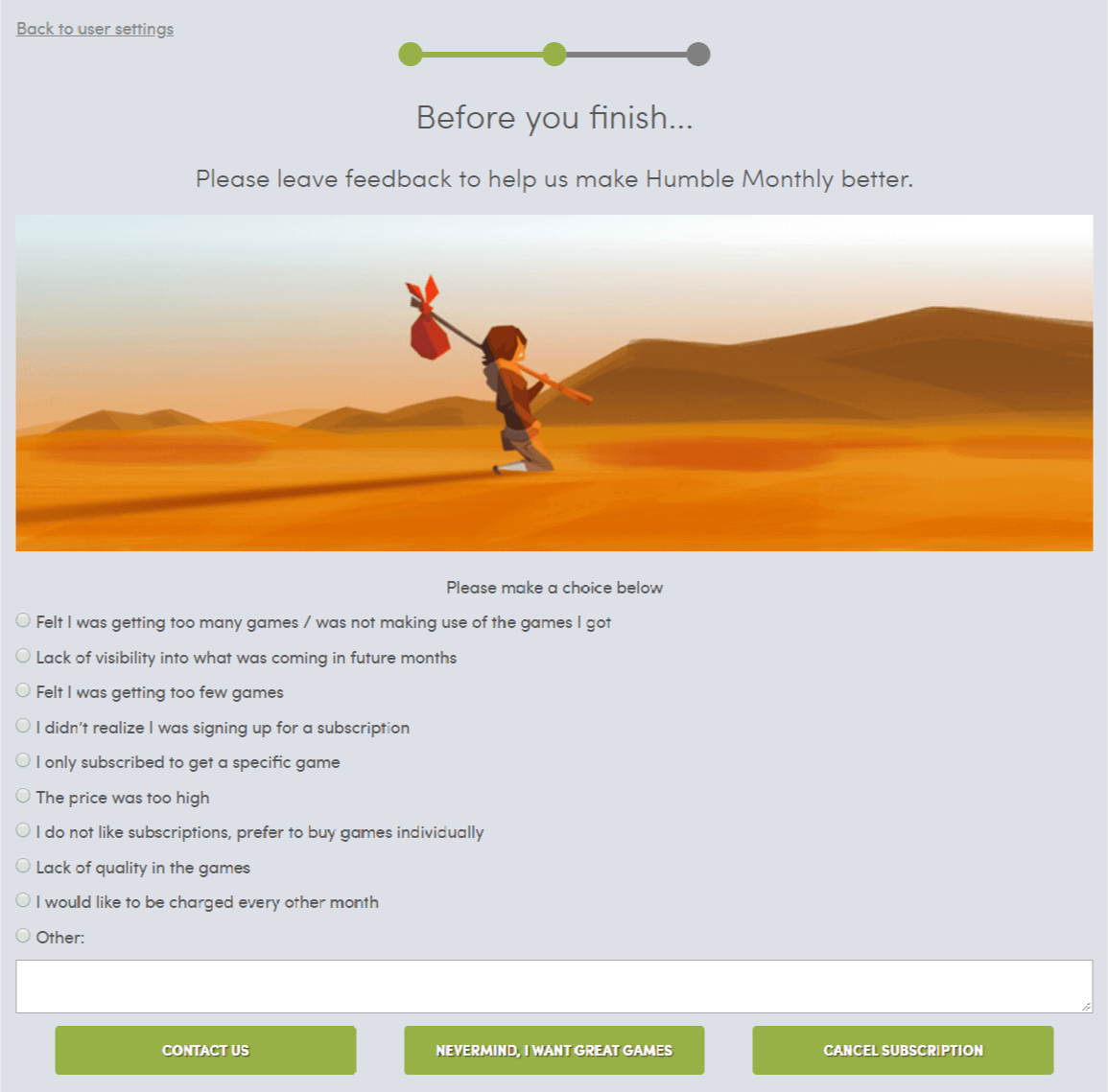 사유를 적당히 고르고 다시 제일 오른쪽의 Cancel Subscription 버튼을 눌러 진행하면 험블 먼슬리 해지가 완료되는 것입니다. 앞서 말씀드렸다시피 해지를 할거면 가급적 빨리 진행하는게 좋습니다. 해지하더라도 해당 번들의 모든 게임은 수령 가능하므로 구독이 갱신되기 전에 아슬아슬하게 해지할 필요가 전혀 없으므로 참고하시기 바랍니다.