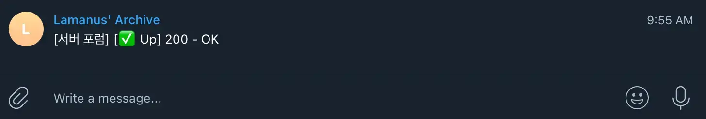 모니터링을 등록하고 나서 텔레그램 알림도 연동을 해봤는데, 다운된 서버가 복구되면서 위와 같이 알림도 잘 전달하고 있습니다. 다양한 알림 설정이 준비되어 있기 때문에 왠만하면 원하는 소프트웨어로 알림을 전달받으실 수 있을 것으로 기대됩니다.
