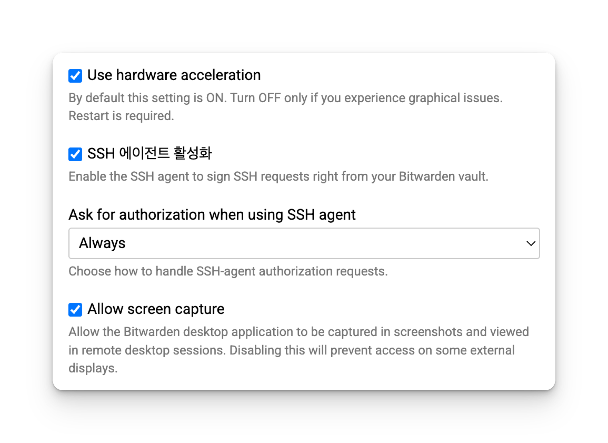 여기서 주목할 만한 점은, SSH 비밀키도 일종의 암호이므로 1Password와 Bitwarden에서 이러한 비밀키를 관리할 수 있는 기능을 제공한다는 것이다. 둘 모두 SSH의 인증을 위한 소켓 프로토콜을 제공하고 있어서, 이를 이용하여 인증 행위를 다른 프로그램으로 넘길 수 있다. 그러면 비밀키를 로컬 디스크에 보관하지 않고도 비밀번호 관리툴을 통해서 안전하게 인증할 수 있는 것이다. 이처럼 SSH의 크레덴셜을 별도로 보관하며 인증을 대신해주는 프로그램을 통상 SSH Agent 라고 부른다.