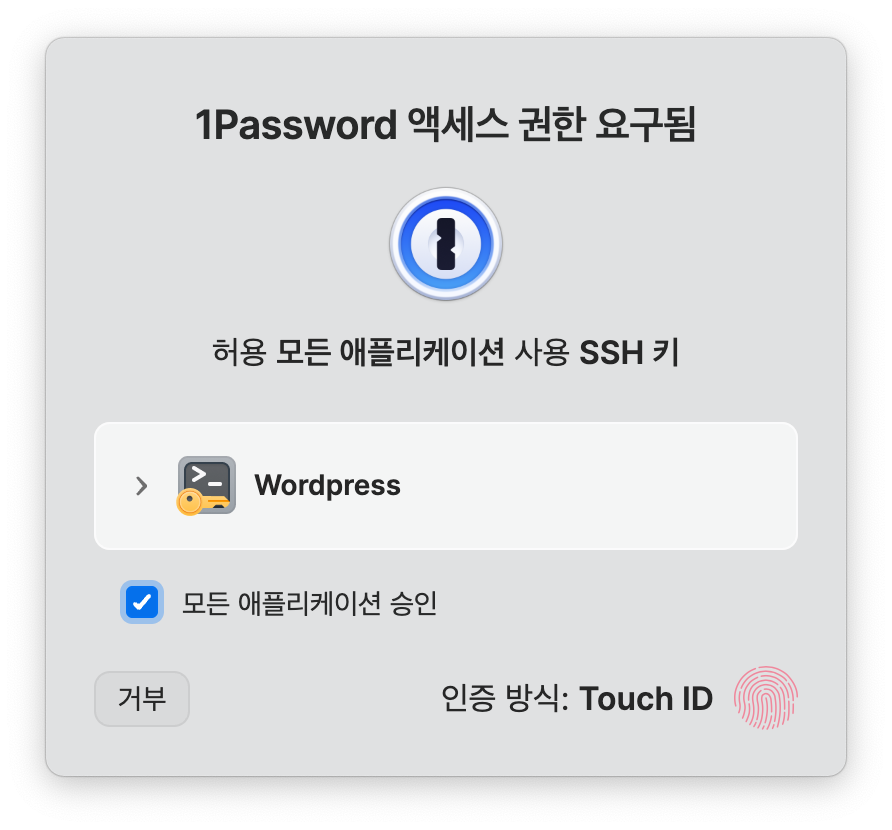 이제 SSH 기능을 테스트 해보도록 하자. 아래 명령을 실행하면 1Password로 연결되고, 거기에서 비밀키를 가져오기 위해서 지문 인증을 요구할 것이다.