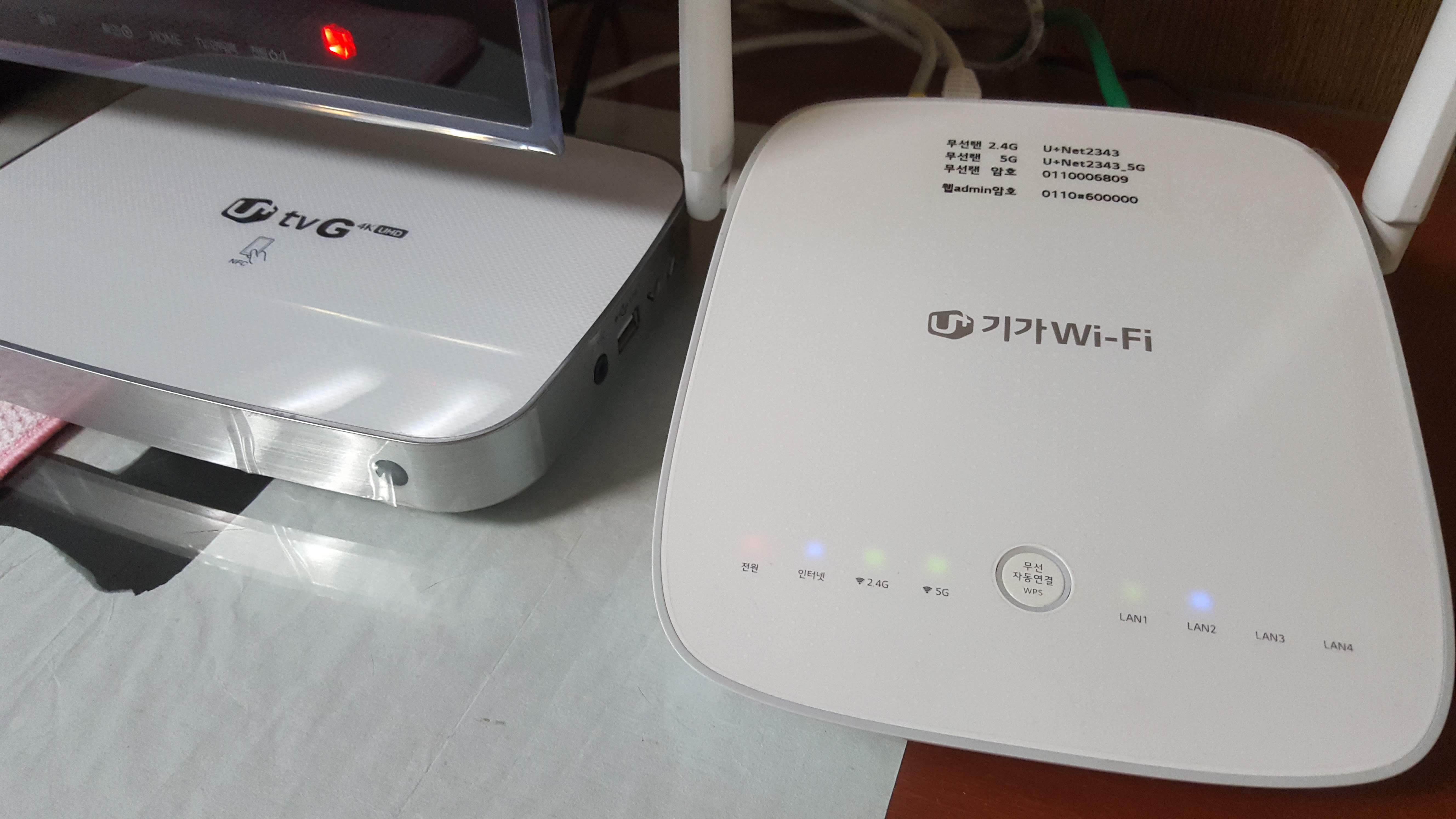 위 사진은 인터넷이 동축 케이블을 통해서 처음 들어오는 방2에 위치한 모뎀 (우측) + 공유기1 (좌측, 기가 GW)입니다. 옛날에 케이블 TV를 제공하는데 쓰였던 동축 케이블 망을 이용해서 인터넷을 제공하는 것으로, 광 케이블에 비하면 품질이 현저히 떨어집니다. 모뎀은 이런 동축 케이블 신호를 받아서 랜선을 이용하여 공유기1에 제공합니다.