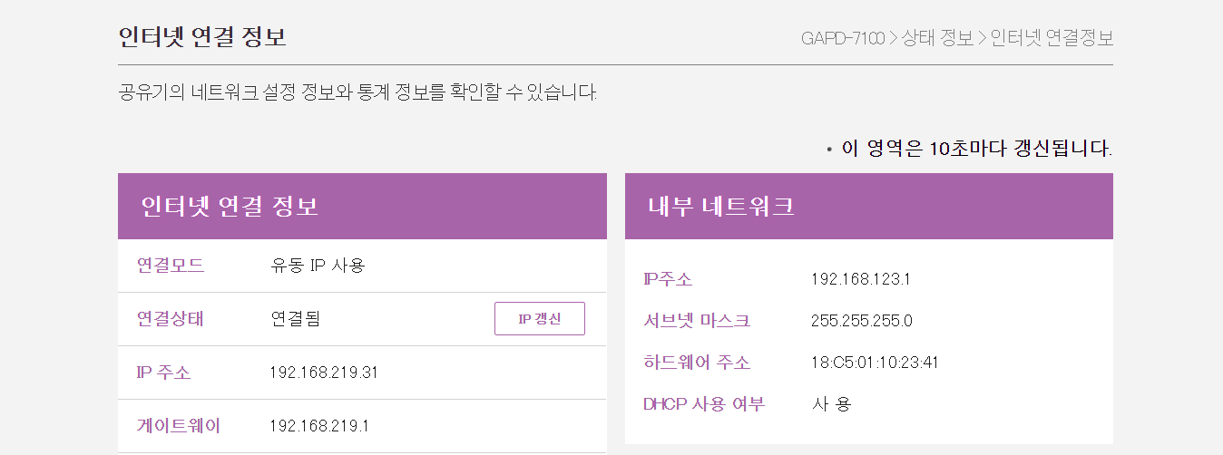 기본 게이트웨이 . . . . . . : 192.168.123.1공유기2의 주소는 그러면 192.168.123.1 이군요. 이 주소와 공유기에 적힌 웹 admin 암호를 이용해서 로그인을 합니다. 그러면 공유기2의 [상태 정보 > 인터넷 연결 정보]를 확인할 수 있습니다.