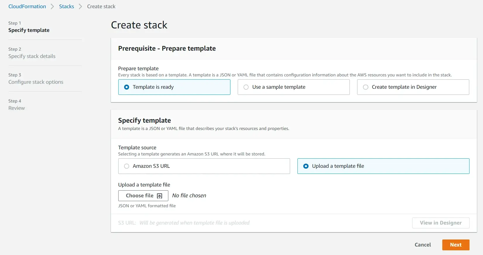 리포지토리에서 다운로드 받은 template.yaml 파일을 CloudFormation으로 업로드합니다.