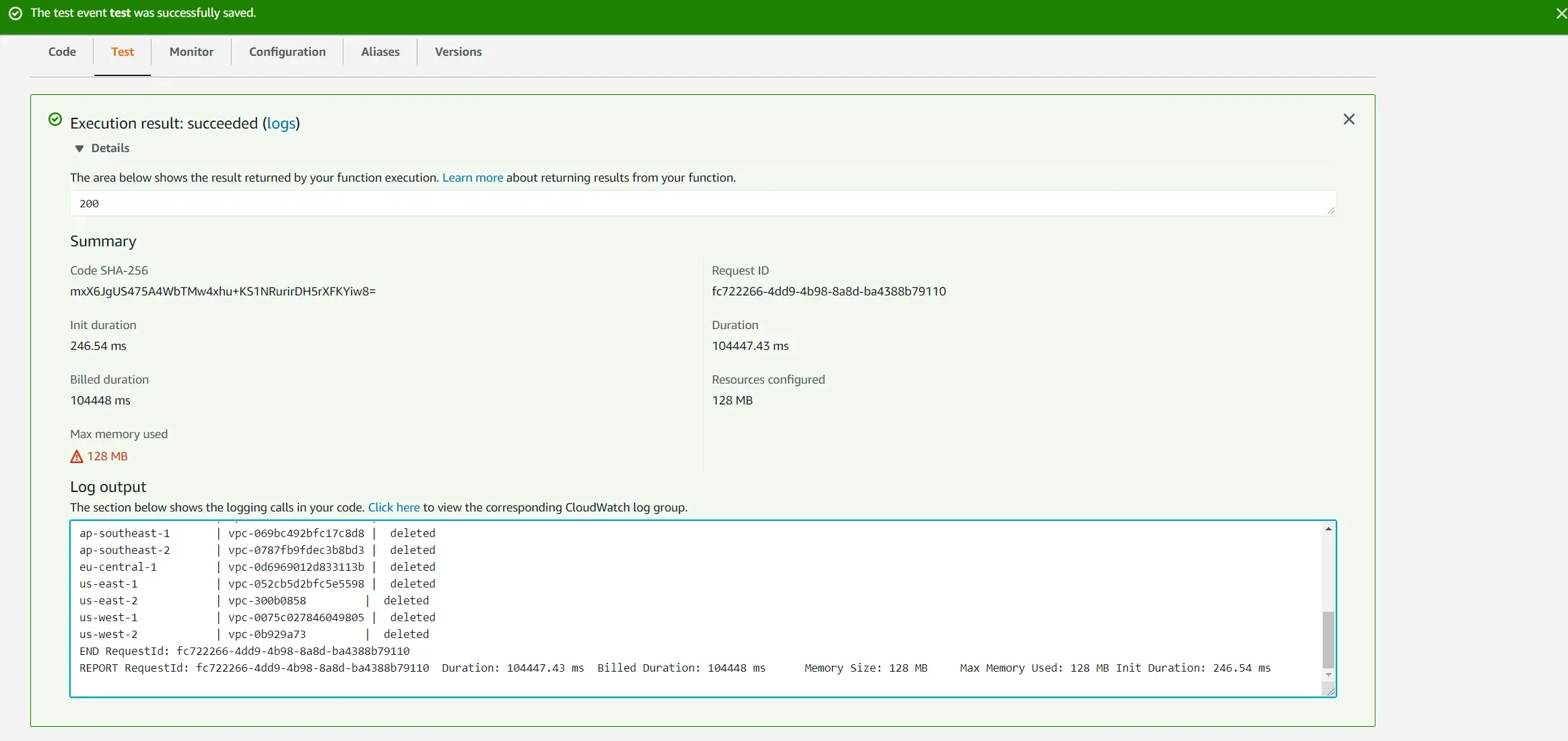 테스트 이벤트의 Payload는 특별한 값을 제공할 필요가 없습니다. 적당히 생성된 테스트 이벤트를 실행하면 약 2분에 걸쳐서 기본 VPC들을 삭제하게 되고, 아래와 같이 결과가 나타나게 됩니다.