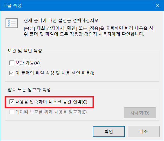 - 디스크 용량이 부족하거나 업데이트로 압축 기능이 켜질 수 있습니다.
