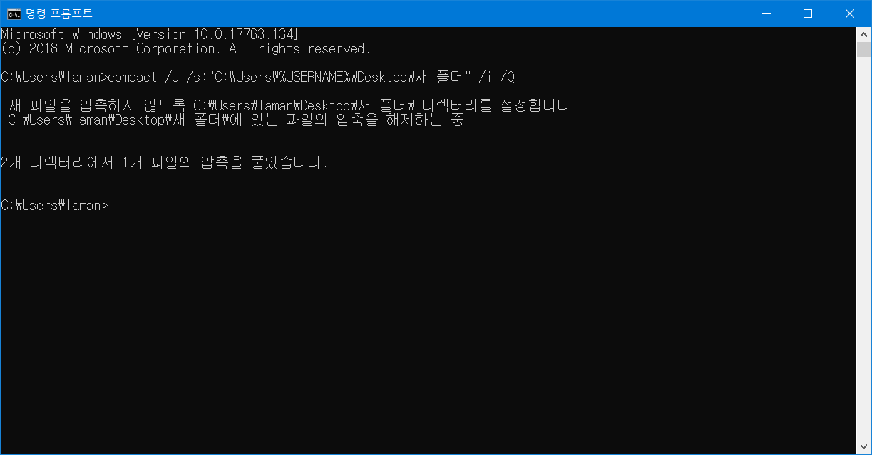 compact /u /s:"경로" /i /Q예를 들기 위해서 바탕화면의 새 폴더를 입력하고 진행하면 아래와 같이 나타납니다.