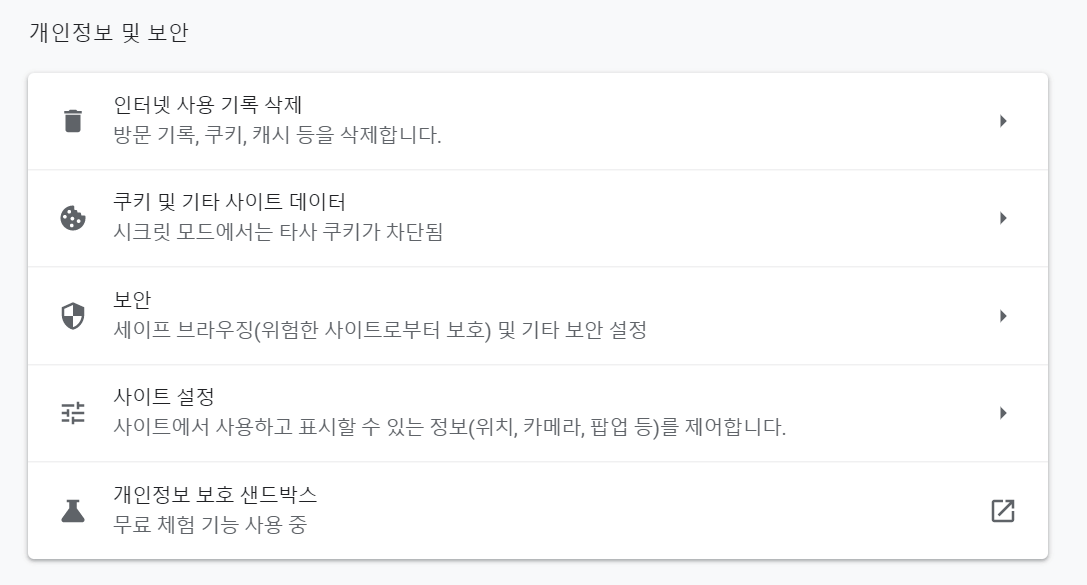 이제 이런 알림형 광고를 차단하기 위해서 어떻게 해야 하는지를 알아보도록 하겠습니다. 특정 사이트에 대한 알림을 추가했으니, 이러한 알림을 삭제하는 방법도 당연히 존재합니다. 일단 크롬의 설정에 들어가서 개인정보 및 보안 항목에 위치한 사이트 설정을 찾습니다.