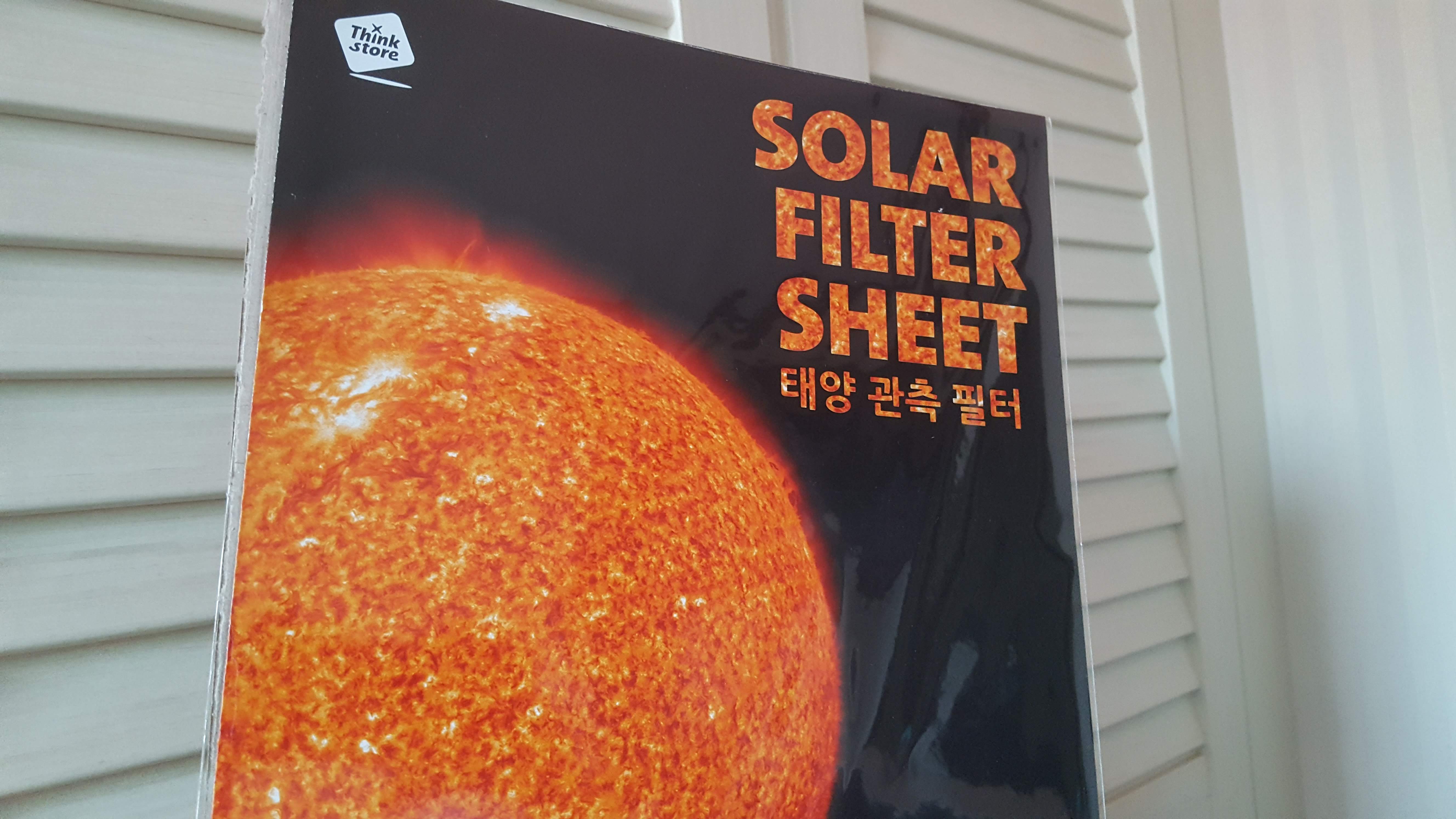 일식을 관측하려면 맨눈으로는 거의 불가능합니다. 특히나 사진을 찍으려면 더더욱 그렇겠지요. 그래서 태양 빛을 1/100,000 으로 줄여주는 필터가 반드시 필요합니다. 카메라에 딱 맞는 필터는 매우 비싸기 때문에, A4 형태로 나오는 Solar Filter Sheet 라는 제품을 이용합니다. 생긴게 정말 A4 용지처럼 생겼습니다.