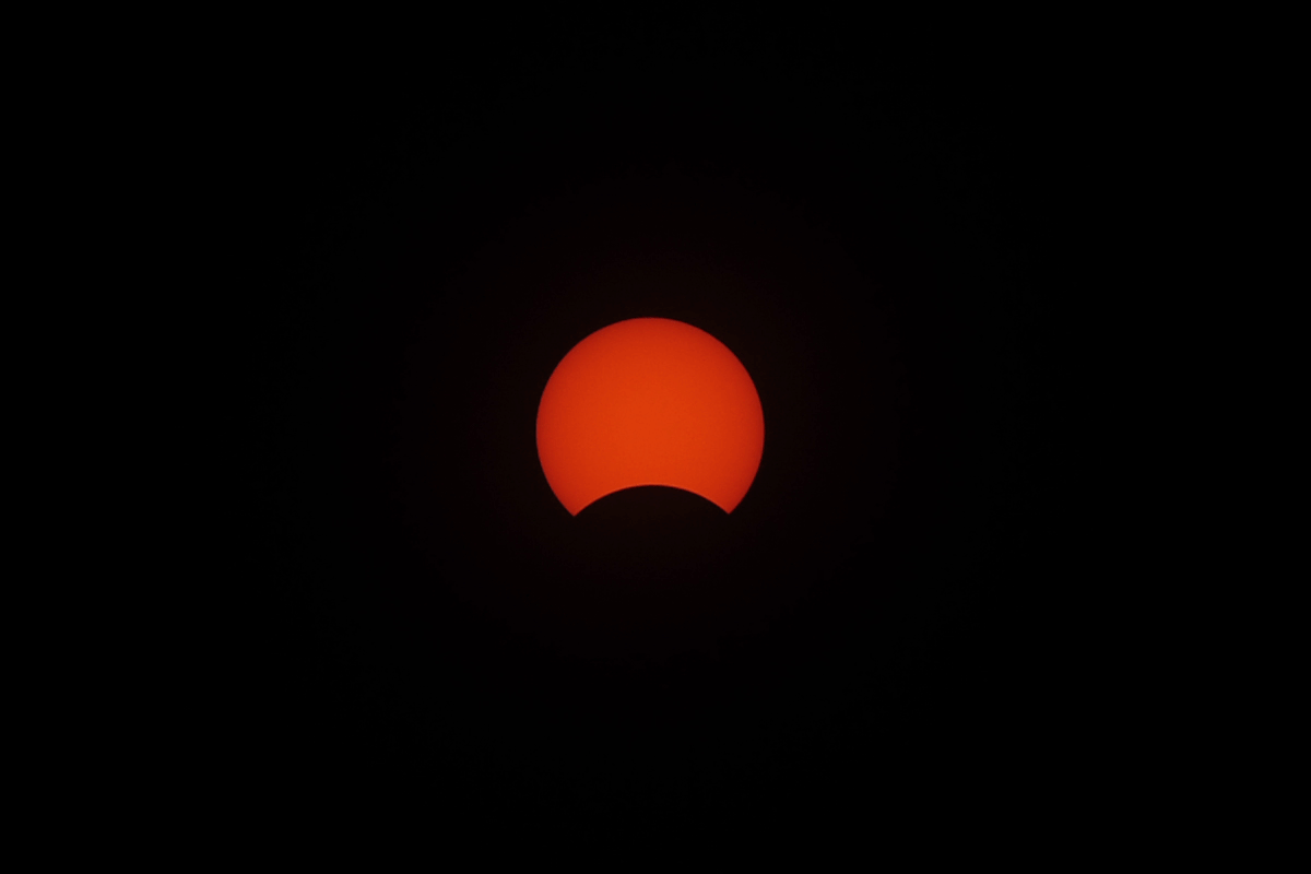 이제는 늙은이가 되어버린 니콘 D700과 시그마 70-200mm 렌즈, 그리고 후드부분에 박스로 만든 태양 필터를 끼워서 일식을 관측할 수 있는 셋팅을 준비하였습니다. 이런 셋팅으로 실제 태양 사진을 찍으면 아래처럼 나옵니다. 200mm로는 한계가 있어서 매우 작게 나오지만... 모양은 나오니까요 ㅠ