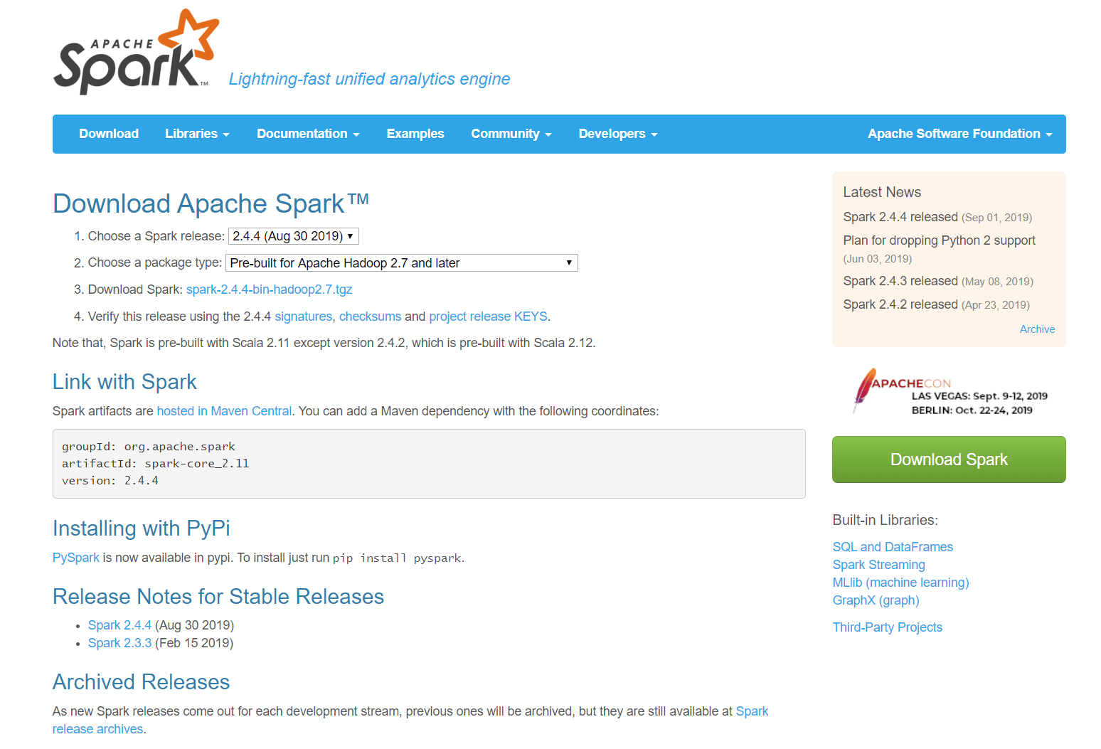 이제 스파크를 설치해야 합니다. 스파크는 별도의 인스톨러가 없기 때문에, 그냥 바이너리 파일을 받아서 폴더에 넣고 환경 변수만 잡아주면 됩니다. 스파크는 하둡 2.7 이상의 버전에 대해서 사전에 빌드된 패키지를 이용하도록 하겠습니다. [링크]