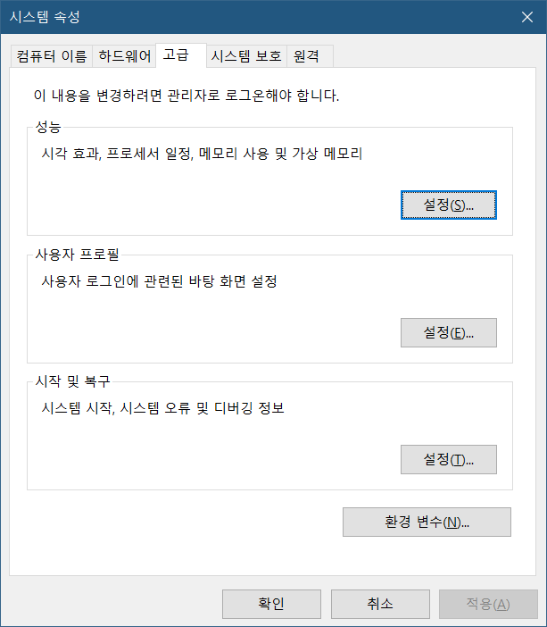 tar -xzvf ./spark-2.4.4-bin-hadoop2.7.tgz그러면 압축 해제된 폴더가 생기는데, 이걸 고정적으로 이용하기 편하고 C:\Program Files 경로가 아닌 곳에 위치를 시킵니다. 관리자 권한으로 접근 가능한 경로는 매우 불편하기 때문에, 저는 C:\Users\%USERNAME%\Documents\spark 경로에 해당 폴더를 모두 옮겼습니다. 이렇게 폴더를 옮겼으면, [윈도우 키] + [Pause 키]를 눌러 [시스템] 화면으로 들어갑니다. 또는, 시작 버튼을 우클릭하여 [시스템]에 들어가고 거기에서 [시스템 정보]를 찾아 들어가면 됩니다. [시스템] 화면 좌측의 [고급 시스템 설정]에 들어가면 [환경 변수] 버튼을 볼 수 있습니다.