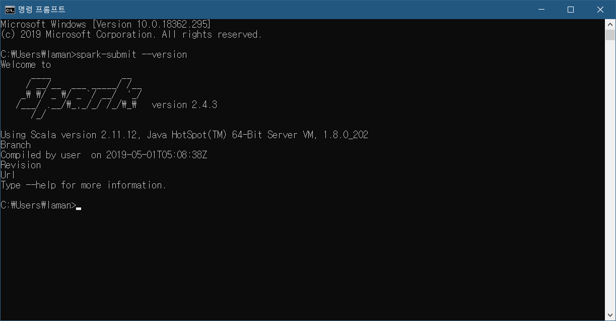 여기까지 잘 따라 오셨으면 cmd에서 스파크의 버전을 확인해볼 수 있습니다. 실행에 시간이 조금 걸릴 수도 있으니 참고하시기 바랍니다.