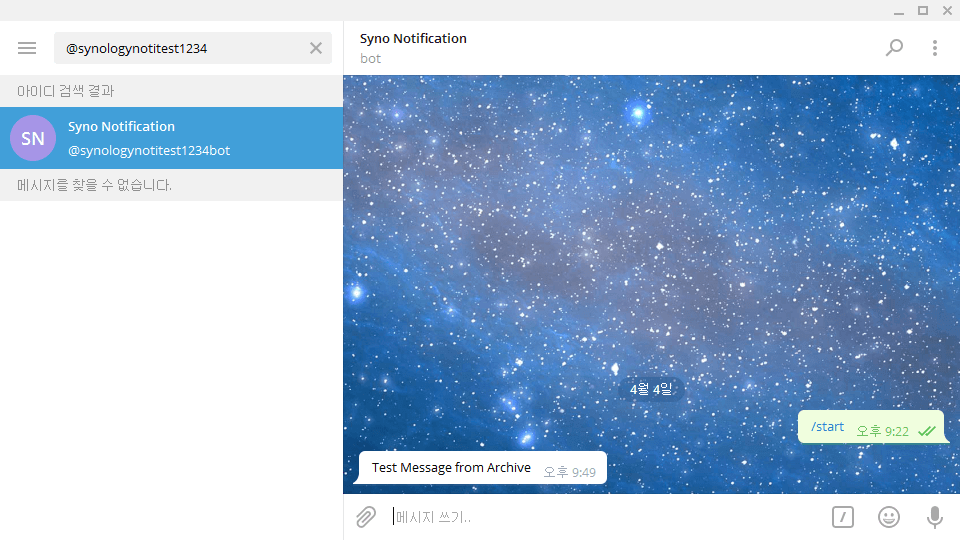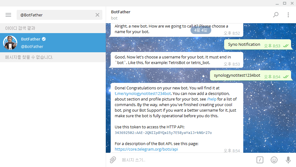 먼저 봇 이름을 입력합니다. 이는 나한테 메시지를 보내는 봇의 이름으로 나타나기 때문에 시놀로지 NAS에서 메시지가 오는 것임을 감안해서 잘 고르시길 바랍니다. 그리고 봇 아이디를 입력해야 하는데, 반드시 아이디 마지막은 bot으로 끝나야 합니다. 아이디는 고유하기 때문에 중복가능성이 있지만 복잡한 아이디여도 처음 검색시에만 귀찮을 뿐 큰 문제 없으니 길게 하셔도 됩니다.