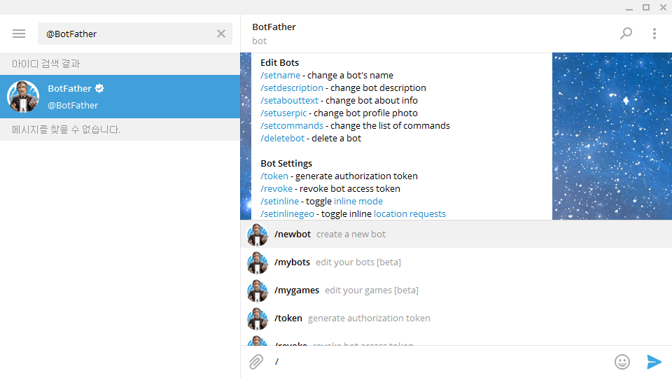 [시작] 버튼을 누르면 각종 커맨드에 대한 안내말이 나타납니다. 우측 아래 / 모양 버튼을 눌러 커맨드를 쉽게 고를 수 있습니다. 새 봇을 만들고자 하므로 /newbot을 골라줍니다.