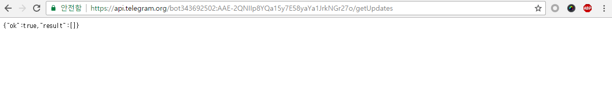 https://api.telegram.org/bot[Token]/getUpdates그러면 거의 백지에 가까운 화면을 볼 수 있습니다.