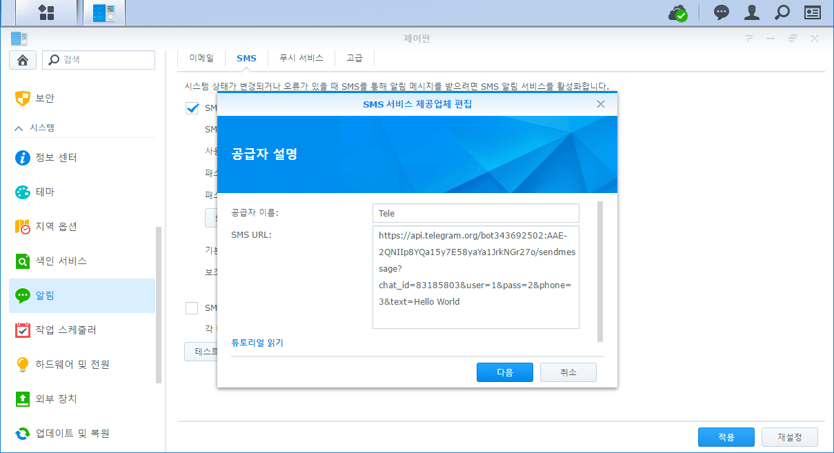 이제 시놀로지 NAS의 [제어판 -> 알림 -> SMS] 항목으로 갑니다. 그리고 [SMS 서비스 제공업체 추가]를 클릭하여 공급자 이름은 무난하게 Telegram정도로 하시고 SMS URL을 아래와 같이 적습니다.