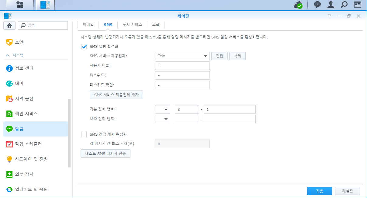 적용을 누르고 앞서 임의로 설정한 1,2,3을 각각 사용자이름, 패스워드 및 패스워드 확인 그리고 기본 전화번호 항목에 넣습니다. 전화번호는 두 개의 필드가 모두 필수값이기 때문에 저처럼 3으로 설정했으면 3-1정도로 입력해도 아무 문제가 없습니다.