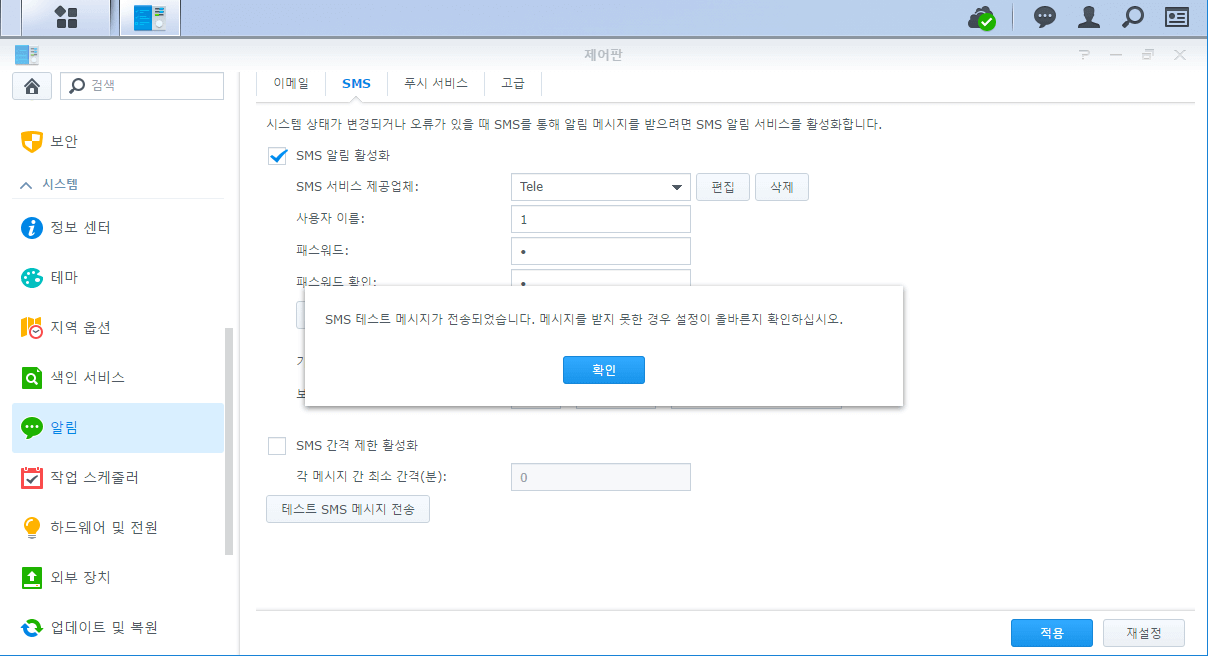이제 모든 설정이 완료되었으므로 [테스트 SMS 메시지 전송]을 눌러 실제로 동작하는지 확인합니다. 정상적으로 작동한다면 텔레그램에서 메시지를 받아볼 수 있습니다.