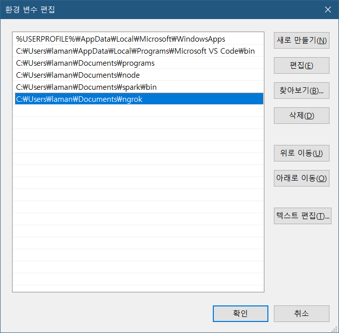 사용자 변수에서 Path를 찾아서 [편집]을 눌러줍니다. 그러면 Path를 추가할 수 있는 화면이 나타나는데, 여기에서 [찾아보기]를 눌러서 아까 ngrok 파일을 가져다 놓은 폴더를 선택해주시면 됩니다.