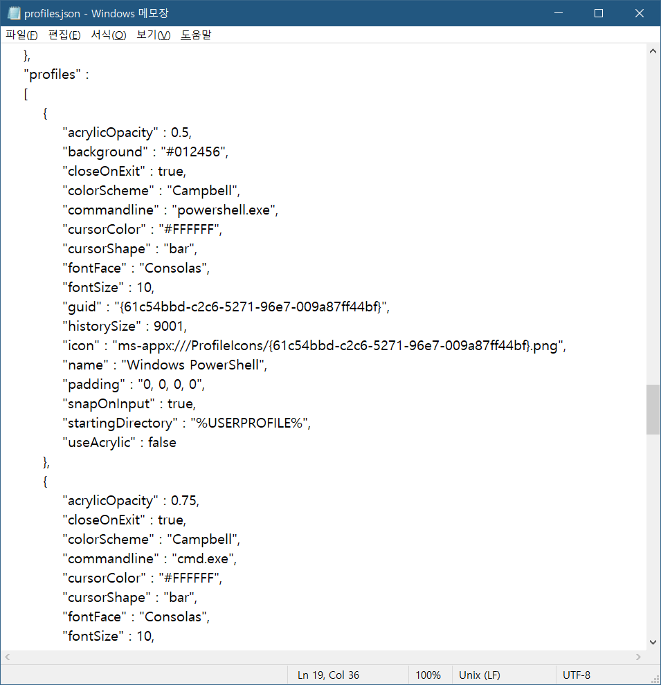 먼저 윈도우 터미널의 설정 화면으로 들어갑니다. 그러면 메모장이 열리는데, 중간 쯤에 profiles라고 있습니다. 이걸 자세히 보시면 기존에 등록된 3개의 터미널이 각각 적혀있는 것을 확인할 수 있습니다.